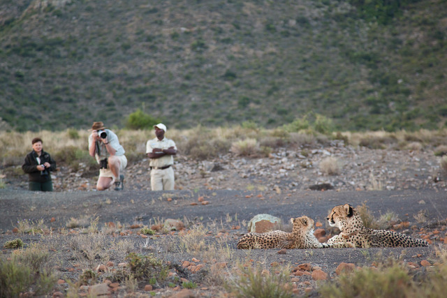 Many of the cheetahs are now habituated to vehicles and humans, allowing for close – though carefully managed – encounters. Some wear radio collars to help trackers monitor them across the rugged terrain. One evening, tracker Klippers climbs onto the tracking seat at the front of our vehicle and heads out in search of Naledi and her cubs. As dusk falls and we prepare to turn back, he disappears on foot with his device – and finds them. Later that night, as we sip drinks at the off-grid Plains Camp, two adult cheetahs materialise silently on the deck to drink from the plunge pool.