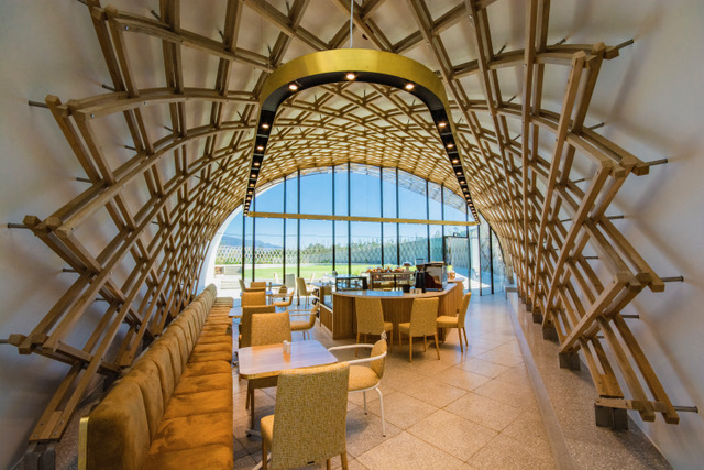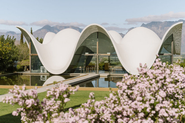 The chapel is unapologetically contemporary; a series of fluid, wave-like curves that appear to float on the water encircling it. Light pours through its glass walls, illuminating simple, pew-like seating for around 120 people. Designed by award-winning architect Coetzee Steyn of Steyn Studio, it manages the rare feat of feeling both monumental and weightless. Unsurprisingly, it has become a sought-after wedding venue.