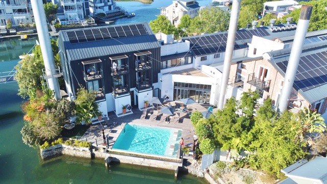 While the power-station heritage provides plenty of novelty, the showstopper is the infinity pool. Set on a wooden deck and shaded by deep-blue umbrellas, it looks out across the canals and waterfront homes, making it an ideal spot to linger. Dining is split between two on-site restaurants: the Island Café and the more casual Gastro Pub, which overlooks Thesen Island and serves local craft beers alongside a cheerful, approachable menu. The prawn and seafood curry is particularly popular, as are the cocktails, mocktails and much-loved cheesecake.
