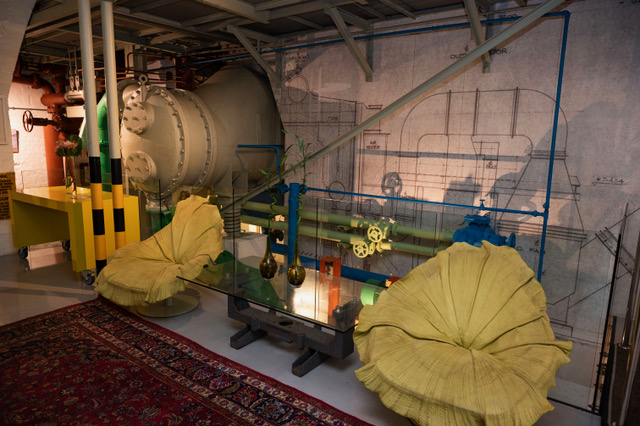 Remnants of this history are everywhere: an old clock-in card machine, restored documents and archival photographs; the original wood boiler and four refurbished electricity generators; and exposed pipes painted in their original functional colours – green for lagoon water, red for steam and blue for cold water.