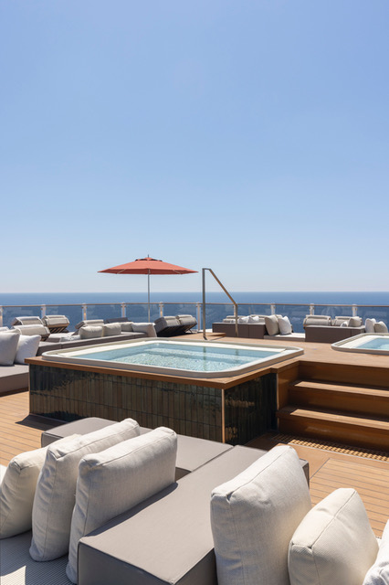 Then there’s the spa – and what a spa it is. It is enormous. Imagine sitting in a thermal pool, hot or cold, inside a double-volume space deep in the belly of the ship, surrounded by the ocean as you sail. There are multiple saunas – Finnish, charcoal (detoxifying properties), infrared, a salt room and even an ice room. House slip by easily, moving between pools, saunas and heated loungers. Treatment rooms offer further indulgence should you want it.