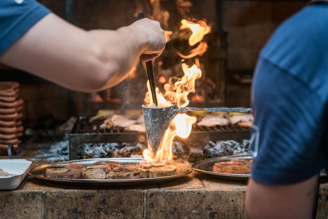 Dessert is Basque-style cheesecake made with cream cheese and mascarpone, baked over the braai. It’s paired with dulce de leche, simmered for hours until deeply caramelised, and burnt hay ice cream, made by washing, drying, burning, infusing, and churning hay into something delicious.